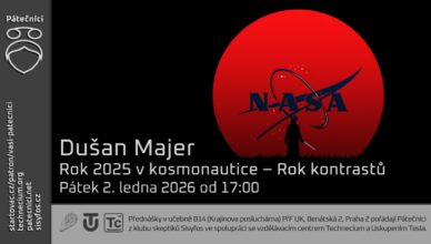 Dušan Majer: Rok 2025 v kosmonautice – Rok kontrastů (2. ledna 2026 – Živě Benátská 2, Přírodovědecká fakulta UK, Praha) 29 prosince, 2025Vítek Comment V pátek 2. ledna od 17 hodin bude na našem cyklu Pátečníci řeč o kosmonautice v roce 2025. O tom promluví popularizátor kosmonautiky Dušan Majer v tradiční úvodní přednášce ... [ pokračovat ve čtení ]